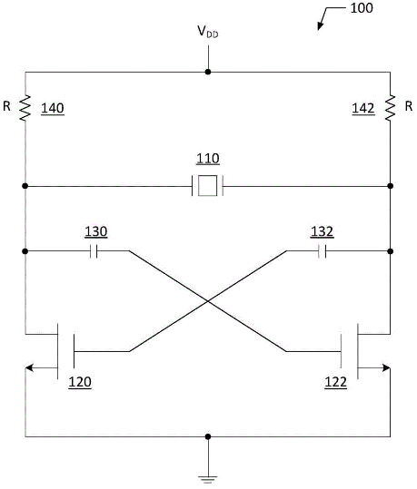 在另一實(shí)施例中,公開了一種用于在差分振蕩器電路的輸出端子處產(chǎn)生振蕩頻率的方法.方法包括:使用耦合在輸出端子之間的晶體管和參考諧振器的交叉耦合配對(duì)產(chǎn)生振蕩頻率;以及使用耦合至晶體管的交叉耦合配對(duì)的MOSFET二極管生成在低頻的低阻抗負(fù)載和在高頻的高阻抗負(fù)載,其中MOSFET二極管中的每一個(gè)包括連接在柵極和漏極端子之間的電阻器.