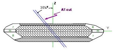 在各種不同種類的切割角度方式中,“1XSE038400AR”, AT角度切割的石英芯片適用在數(shù)MHz到數(shù)佰MHz的頻率范圍,是石英芯片應(yīng)用范圍最廣范及使用數(shù)量最多的一種切割應(yīng)用方式. 在(圖五)中, 從石英晶棒X-軸向的上視圖, 可以看到對Z-軸向旋轉(zhuǎn)約35度的AT 方向. 這在大量生產(chǎn)的技術(shù)上也是很好達成的一種作業(yè)方式.