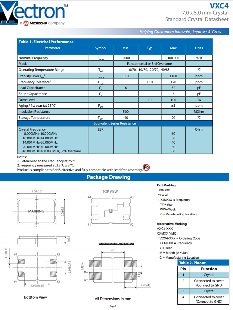 用于JEDEC J-STD-020D.01回流條件的耐熱可用性需個別判斷。請聯(lián)系我們以便獲取相關信息。Vectron晶振,VXC4晶振,7050mm晶振.