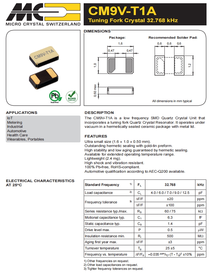 6G物聯(lián)網(wǎng)晶振,Micro微晶音叉晶體,CM9V-T1A-32.768kHz-12.5pF-20PPM-TA-QC
