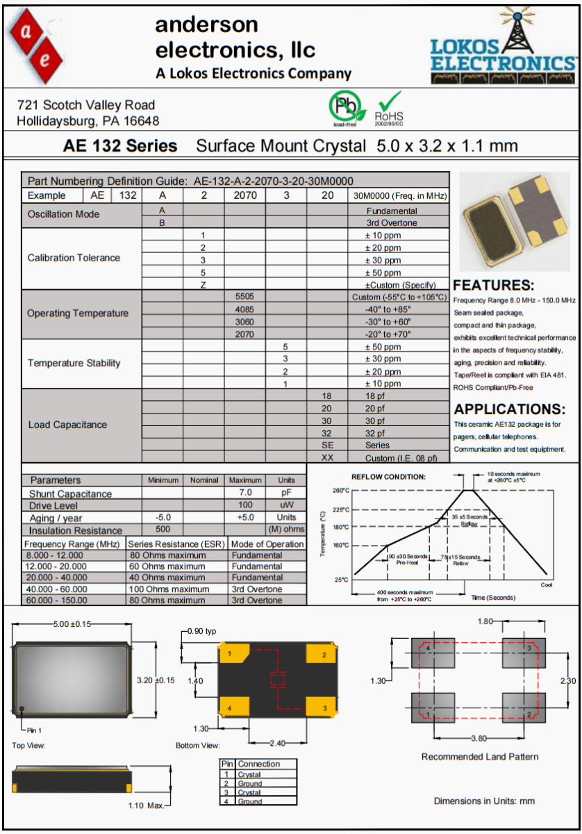 Anderson ultra-reliable AE132 crystal oscillator, AE132 crystal oscillator features: frequency range 8.0MHz - 150.0MHz slot sealing package, compact and thin package, in the frequency stability, aging, accuracy, reliability and other aspects of excellent technical performance. Tapes/reels comply with EIA 481 standards. Certified lead free/Pb-Free