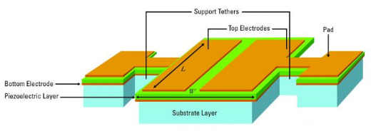 將電刺激施加到頂部電極之一激勵(lì)壓電層,其中橫向壓電系數(shù)e31在整個(gè)裝置中產(chǎn)生體聲波.然后諧振器橫向振動(dòng),并且機(jī)械運(yùn)動(dòng)通過(guò)壓電層轉(zhuǎn)換以由另一個(gè)頂部電極感測(cè).器件的橫向長(zhǎng)度L,組合諧振器本體EEFF的有效彈性常數(shù)和有效質(zhì)量密度決定了基模的諧振頻率.