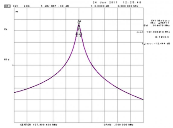 當(dāng)體聲波在諧振器主體中沿不同方向分散時(shí),通過(guò)設(shè)計(jì)諧振器的厚度和寬度以使來(lái)自其他方向的損失最小化,可以使所需長(zhǎng)度方向上的能量最大化.例如,典型的107-MHz諧振器圖顯示測(cè)得的Q值為7453,IL為-12.4dB(圖2).