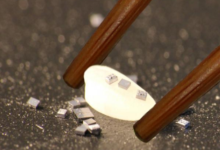 在這張照片中,將單個(gè)晶圓級(jí)封裝的pMEMS晶振放在一粒米上.