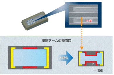 超小型音叉型晶體單元/超小型實時時鐘模塊,使用光刻技術對振動片進行三維立體加工,不改變以前的構造(左圖)進行小型化時,電極(紅色部分)的面積會變小.通過形成H型槽的構造,既確保了電極的面積,又提高了電解效率. 因此實現了即使是超小型晶振也具有與以前的規(guī)格同等的低CI值.