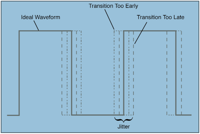 從這個(gè)測(cè)量中,我們可以看到石英晶體振蕩器的瞬時(shí)頻率不是恒定的——它與標(biāo)稱頻率相差很小,在任何給定的時(shí)間點(diǎn)都會(huì)造成頻率的不確定性.這種頻率變化可以被視為波形邊緣相對(duì)于理想標(biāo)稱頻率邊緣的時(shí)間變化.邊緣的這種時(shí)間變化稱為抖動(dòng).圖1說明了方波的抖動(dòng)效應(yīng).