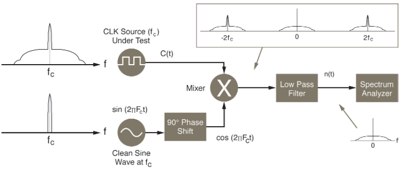測(cè)量相位噪聲并非易事.大多數(shù)頻譜分析儀沒有直接測(cè)量晶體振蕩器相位噪聲的分辨率.圖3顯示了相位噪聲測(cè)試的正常配置.與被測(cè)振蕩器頻率相同的“理想”源與振蕩器混合.這產(chǎn)生了這兩個(gè)信號(hào)的乘積,也產(chǎn)生了差異.使用低通濾波器,如果“理想”源與振蕩器的頻率完全相同,產(chǎn)品將被剝離,只留下差異,這將是振蕩器噪聲.