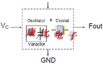 通過(guò)向其控制電壓引腳(VC)施加模擬電壓,其輸出頻率(Fout)可以在連續(xù)的頻率范圍內(nèi)在任一方向上偏離標(biāo)稱值.控制電壓與變?nèi)荻O管相連.這種二極管的可變電容是所施加電壓的函數(shù).在圖1和圖2中,請(qǐng)注意,隨著可變電容的變化,它會(huì)導(dǎo)致電容負(fù)載的變化.CL的變化導(dǎo)致Fout的變化.如圖2所示,理想情況下,VC和Fout之間存在線性關(guān)系.