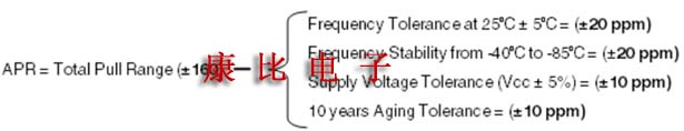 APR是從VCXO的輸出頻率范圍預(yù)算中得出的,該預(yù)算考慮了導(dǎo)致VCXO頻率偏差的所有因素.請(qǐng)參考示例計(jì)算.