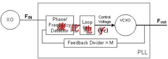 鎖相環(huán)通過(guò)將壓控振蕩器時(shí)鐘頻率和相位除以反饋分頻器(M)的值,并將其與相位/頻率檢測(cè)器中輸入時(shí)鐘頻率和相位(FIN)的相位和頻率進(jìn)行比較,從而產(chǎn)生誤差信號(hào).相位/頻率檢測(cè)器的輸出由環(huán)路濾波器進(jìn)行低通濾波,以產(chǎn)生FOUT的控制電壓調(diào)整,從而閉合環(huán)路.鎖定時(shí),鎖相環(huán)的輸出頻率(FOUT)正好是輸入頻率的M時(shí)代,并與輸入?yún)⒖紩r(shí)鐘相位對(duì)齊.如果Fout必須等于Fin,則添加值為M的后分頻器或?qū)設(shè)置為1.