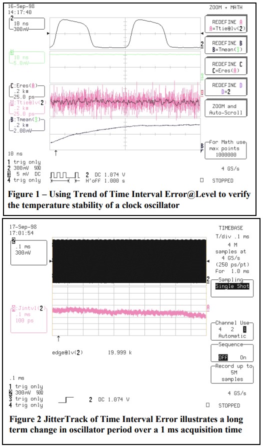 The greatest strength of the LeCroy jitter and timing analysis package is the ability to study both long term and short term variations in oscillator timing. Long memory and SmartTriggers make it easy to acquire and display this data Specialized jitter measurements combined with the capability to measure and correlate the effects of other parameters such as temperature or supply voltage are ideal for evaluating environmental stability