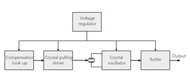 TCXO調(diào)節(jié)振蕩器的頻率以補(bǔ)償由于溫度變化而發(fā)生的變化.為實(shí)現(xiàn)這一目標(biāo),TCXO中的主要元件是壓控振蕩器(VCXO).它連接到一個(gè)檢測(cè)溫度的電路,并向振蕩器施加一個(gè)小的校正電壓,如下所示.