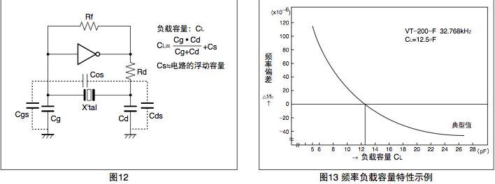 負(fù)載容量 (CL) 是用來決定在振蕩電路中晶振頻率的參數(shù),從加在振蕩電路中晶振兩端的電容可知負(fù)載容量(參閱圖12). 因振蕩電路的負(fù)載容量的不同,晶振的頻率會相應(yīng)地產(chǎn)生變動.為了獲得目標(biāo)的頻率精度,必須使晶振與負(fù)載容量相匹 配.在使用時,請根據(jù)相應(yīng)晶振的負(fù)載容量,將振蕩電路的負(fù)載容量設(shè)定為與其相符.