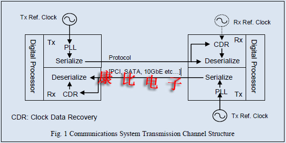 圖1顯示了一個(gè)典型的通信系統(tǒng)(傳輸信道),其中兩個(gè)收發(fā)器之間的數(shù)據(jù)轉(zhuǎn)發(fā)由多種協(xié)議(PCI,SATA,10GbE等)介導(dǎo).).在這種類型的系統(tǒng)中,有源晶振振蕩器用于產(chǎn)生參考時(shí)鐘.通常,數(shù)據(jù)在發(fā)送方被參考信號(hào)串行化,以說明參考信號(hào)以低于數(shù)據(jù)速率的頻率振蕩.因此,發(fā)射器的內(nèi)部鎖相環(huán)(鎖相環(huán))用于將參考信號(hào)乘以所需頻率,并傳輸數(shù)據(jù).相反,在接收端,基于鎖相環(huán)的時(shí)鐘數(shù)據(jù)恢復(fù)(CDR)用于從傳輸?shù)臄?shù)據(jù)流中再生參考信號(hào),然后再生的參考信號(hào)用于重構(gòu)數(shù)據(jù).在一些高端系統(tǒng)中,接收端具有用于數(shù)據(jù)重建的嵌入式參考信號(hào).利用這種數(shù)據(jù)傳輸,信號(hào)轉(zhuǎn)換和再生是永久進(jìn)行的,并且利用高速通信,接收端必須準(zhǔn)確地將發(fā)送的數(shù)據(jù)識(shí)別為0和1.因此,如何限制實(shí)際信號(hào)的退化水平(抖動(dòng),噪聲),提高信號(hào)質(zhì)量以及如何有效地設(shè)計(jì)傳輸信道專用集成電路成為至關(guān)重要的問題. [信號(hào)質(zhì)量評(píng)估方法]