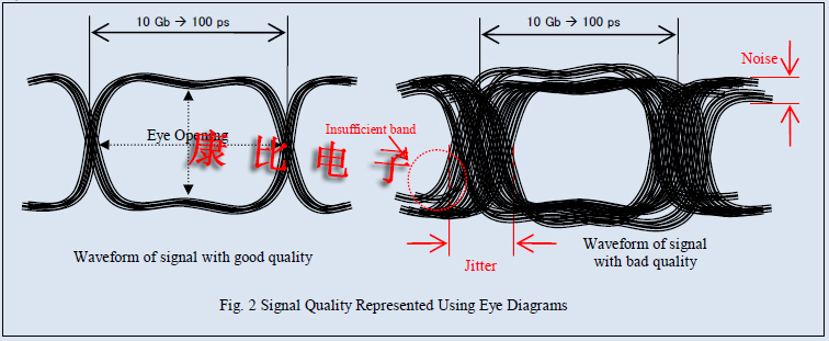 眼圖通常被用作評(píng)估通信系統(tǒng)中信號(hào)質(zhì)量的方法.這些圖表使用示波器或類似的測量設(shè)備采集高速數(shù)字信號(hào)波形的多個(gè)樣本.然后,這些波形相互疊加,形成圖形表示."眼圖"這個(gè)名字來源于類似眼睛的分層波形的視覺外觀.例如,我們將看看10GbE何時(shí)被用作傳輸信道通信協(xié)議.在該系統(tǒng)中,轉(zhuǎn)發(fā)10Gbps信號(hào)所需的時(shí)間(長度)相當(dāng)于每比特信號(hào)100psec.為了評(píng)估信號(hào)質(zhì)量,信號(hào)每100psec重復(fù)一次,以獲得眼圖.例如,如果我們假設(shè)參考信號(hào)是純的,并且傳輸通道專用集成電路設(shè)計(jì)良好,那么我們將觀察到如圖2左側(cè)所示的對(duì)齊良好的波形.相反,在信號(hào)丟失的情況下,例如由具有顯著石英晶體振蕩器噪聲或抖動(dòng)的參考信號(hào)或設(shè)計(jì)不良的專用集成電路引起的傳輸信道頻帶不足,信號(hào)波形是不穩(wěn)定的,波形的分層導(dǎo)致如圖2右側(cè)所示的"閉眼"類型.將信號(hào)數(shù)據(jù)識(shí)別為0或1在很大程度上依賴于眼睛睜開的水平和垂直方向