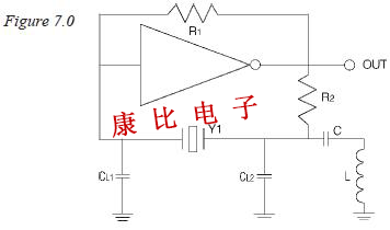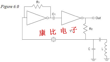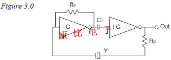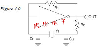 電阻器R1和R2具有與圖3.0所示串聯(lián)諧振電路相同的功能.兩個負載電容CL1和CL2用于確定晶體單元以及振蕩器的工作頻率.晶體單元Y1是并聯(lián)諧振晶體單元,被指定以負載電容的指定值,期望的頻率以及期望的頻率容限和穩(wěn)定性工作.