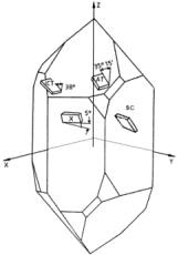 不同的石英晶體切割可以制成具有不同的性質(zhì)。切口由圍繞晶軸的兩個(gè)旋轉(zhuǎn)角度phi和theta定義。最常見的切割是單旋轉(zhuǎn)AT切割(φ= 0°)和雙旋轉(zhuǎn)SC切割(φ= 22°)。兩種情況下的θ角都在34°左右。其他雙旋轉(zhuǎn)切割如MSC-,IT-,F(xiàn)C-,LD-也適用于特殊應(yīng)用。