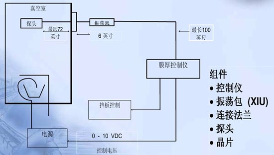 膜厚控制儀用電子組件引起晶振片的高速振動(dòng),約每秒6百萬(wàn)次(6MHz),鍍膜時(shí),測(cè)試每秒鐘振動(dòng)次數(shù)的改變,從所接受的數(shù)據(jù)中計(jì)算膜層的厚度。為了確保晶振片以6MHz的速度振動(dòng),在真空室外裝有“振蕩器”,與晶控儀和探頭接口連接,振蕩器通過(guò)迅速改變給晶振片的電流使晶振片高速振動(dòng)。